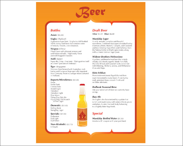 Bar Menu Taking inspiration from their existing logo, I designed a bar menu to feature drinks offered in the restaurant's newly built bar and lounge.