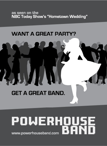 Black and White Ad for Powerhouse Band, showcasing their talent as a wedding band.