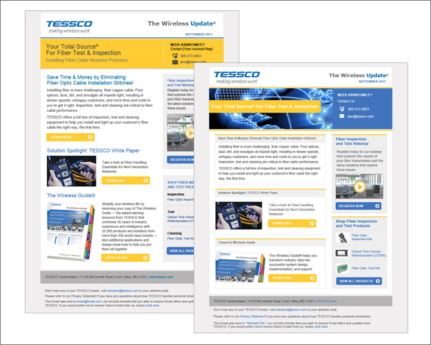 Sub-contracted with R2Integrated to work on HTML Emailers for TESSCO. Adjusted existing templates in Adobe Photoshop to layout new content, providing a balanced design that adhered to the template style. Built HTML emailers using table-based code, and tested compatibility of email clients using Litmus.com.